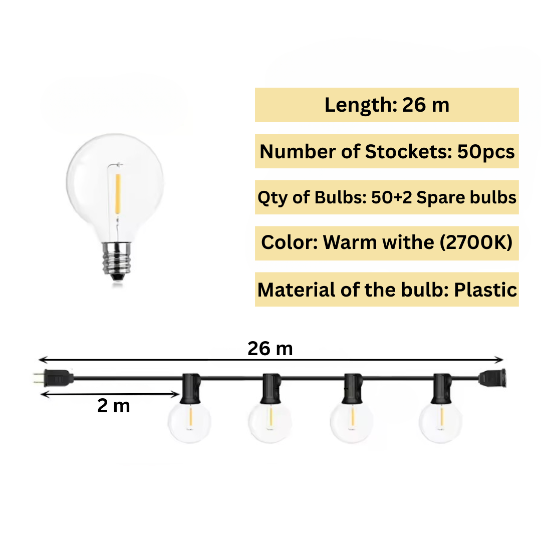 Die strombetriebene G40 Lichterkette ist in 110V oder 220V erhältlich und somit vielseitig einsetzbar – ideal für Garten, Balkon, Straße oder Campingplatz. Die bruchsicheren G40 LED-Leuchtmittel überzeugen durch Energieeffizienz, lange Lebensdauer und ein charmantes Retro-Design.